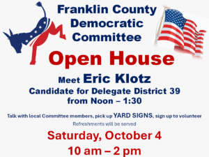 Join the Franklin County Democrats at an open house, with the chance to meet with committee members, tour our office, pick up yard signs supporting our ticket and meet with our engaging candidate for HD 39, Eric Klotz. Refreshments will be available. Drop in any time during 10 and 2.