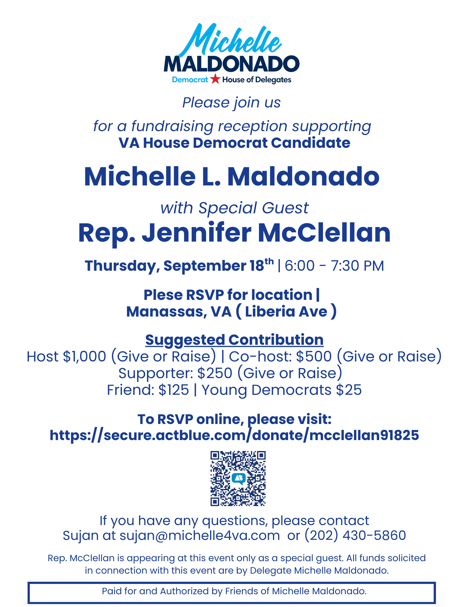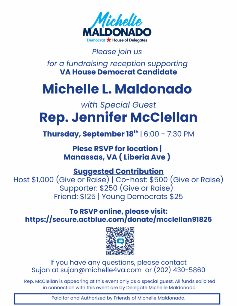 Share Fundraiser for Delegate Michelle Maldonado in HD-20 with Special Guest, Congresswoman Jennifer McClellan. Location RSVP for location Date Thursday, September 18th, 2025 RSVP Back to Events
